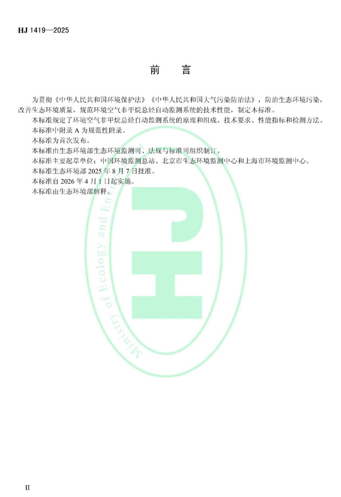 為貫徹《中華人民共和國環(huán)境保護法》《中華人民共和國大氣污染防治法》,防治生態(tài)環(huán)境污染,改善生態(tài)環(huán)境質(zhì)量,規(guī)范環(huán)境空氣非甲烷總烴自動監(jiān)測系統(tǒng)的技術(shù)性能,生態(tài)環(huán)境部制定國家生態(tài)環(huán)境標(biāo)準(zhǔn)《環(huán)境空氣非甲烷總烴自動監(jiān)測系統(tǒng)技術(shù)要求及檢測方法(HJ 1419—2025)》。本標(biāo)準(zhǔn)為首次發(fā)布,自2026年4月1日起實施。