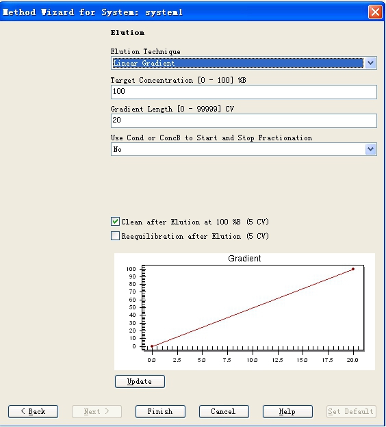 蛋白純化系統(tǒng)的程序設(shè)定操作在method editor窗口點(diǎn)擊工具欄內(nèi)的method wizard,彈出窗口界面如Fig 11所示,可以分別在main selection、column以及column position三個(gè)下拉菜單中選擇所要用到的層析方法、所用到的層析柱的參數(shù)以及所安裝的層析柱在柱位選擇閥的位置,選好之后,點(diǎn)擊next按鈕進(jìn)入下一步波長和溶液進(jìn)口的設(shè)定(Fig 12),在此可以設(shè)定檢測的波長,針對(duì)AKTA EXPLORER可以一次選擇三個(gè)波長共同進(jìn)行監(jiān)控,并在此設(shè)定A泵和B泵的溶液進(jìn)口,設(shè)定好之后,點(diǎn)擊next,出現(xiàn)如Fig 13所示窗口,可以在此設(shè)定對(duì)層析柱進(jìn)行平衡的條件。