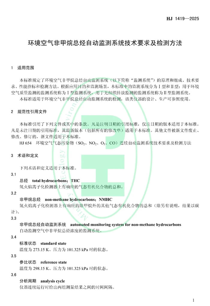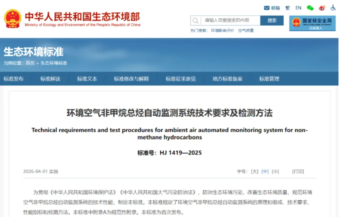 為貫徹《中華人民共和國環(huán)境保護法》《中華人民共和國大氣污染防治法》,防治生態(tài)環(huán)境污染,改善生態(tài)環(huán)境質(zhì)量,規(guī)范環(huán)境空氣非甲烷總烴自動監(jiān)測系統(tǒng)的技術(shù)性能,生態(tài)環(huán)境部制定國家生態(tài)環(huán)境標(biāo)準(zhǔn)《環(huán)境空氣非甲烷總烴自動監(jiān)測系統(tǒng)技術(shù)要求及檢測方法(HJ 1419—2025)》。本標(biāo)準(zhǔn)為首次發(fā)布,自2026年4月1日起實施。