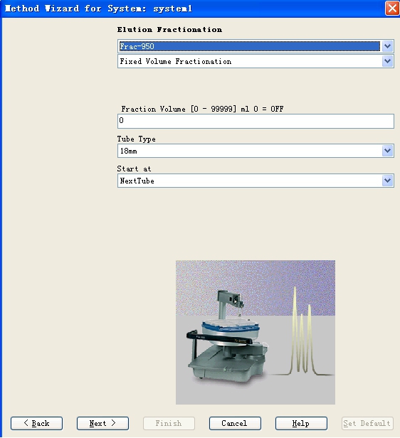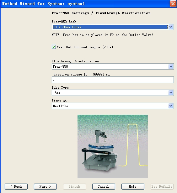 在上步設(shè)置完成之后,點(diǎn)擊NEXT出現(xiàn)如Fig 15所示窗口,這里是針對(duì)流穿組分收集所進(jìn)行一些設(shè)置,針對(duì)安裝的不同的收集器,具體內(nèi)容可能有些差異,這里顯示的界面是在安裝了Frac-950收集器之后所出現(xiàn)的界面,設(shè)置完成點(diǎn)擊NEXT出現(xiàn)如Fig 16所示的窗口,設(shè)置目標(biāo)組分收集的一些參數(shù),點(diǎn)擊NEXT,出現(xiàn)如Fig 17所示的窗口,針對(duì)具體的洗脫條件可以進(jìn)行設(shè)置。