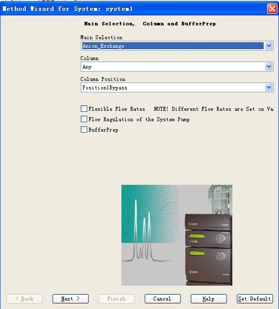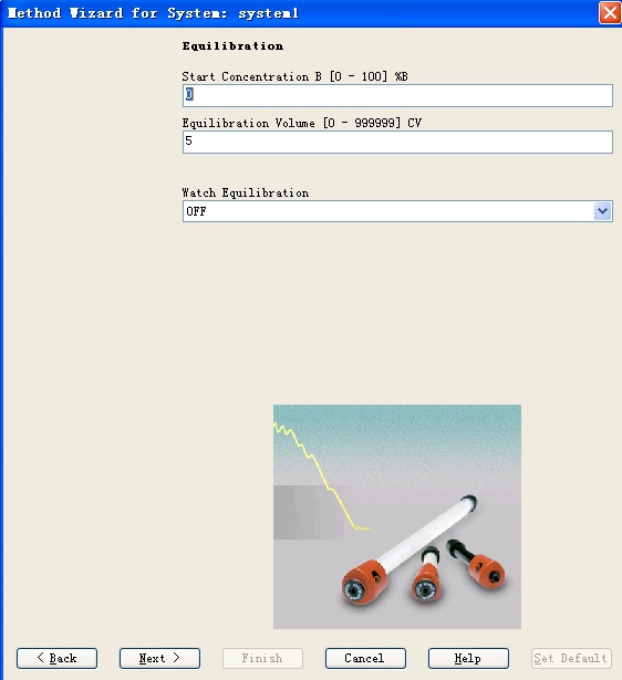 蛋白純化系統(tǒng)的程序設(shè)定操作在method editor窗口點(diǎn)擊工具欄內(nèi)的method wizard,彈出窗口界面如Fig 11所示,可以分別在main selection、column以及column position三個(gè)下拉菜單中選擇所要用到的層析方法、所用到的層析柱的參數(shù)以及所安裝的層析柱在柱位選擇閥的位置,選好之后,點(diǎn)擊next按鈕進(jìn)入下一步波長和溶液進(jìn)口的設(shè)定(Fig 12),在此可以設(shè)定檢測的波長,針對(duì)AKTA EXPLORER可以一次選擇三個(gè)波長共同進(jìn)行監(jiān)控,并在此設(shè)定A泵和B泵的溶液進(jìn)口,設(shè)定好之后,點(diǎn)擊next,出現(xiàn)如Fig 13所示窗口,可以在此設(shè)定對(duì)層析柱進(jìn)行平衡的條件。